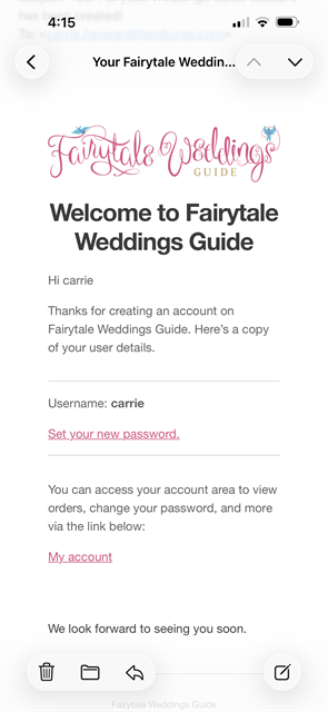 An account was automatically created for you when you bought the guide. You should have received an email with the subject “Your Fairytale Weddings Guide account has been created!” that allows you to set your password so you can log back in. (If you don’t see it, check your Spam folder.)